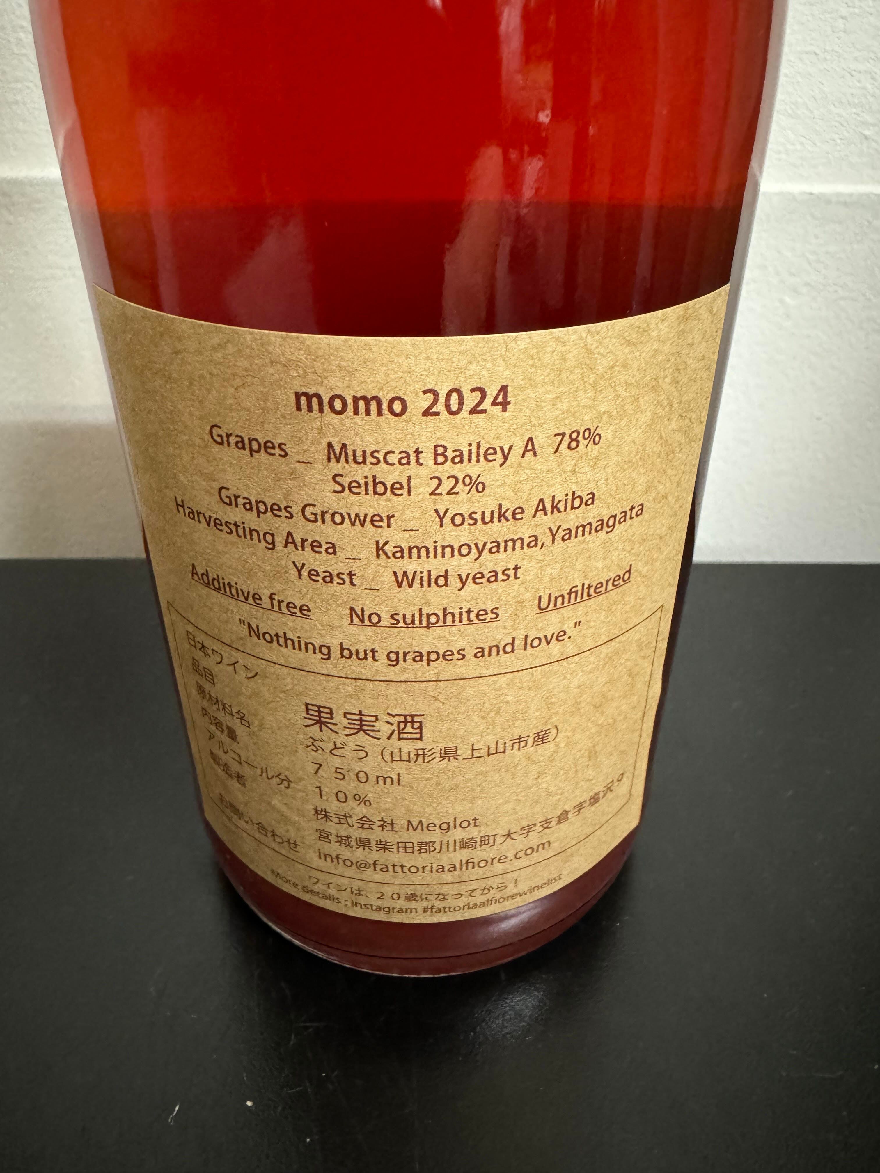 momo というワインの私たちなりの定義は、日本で品種改良されたマスカットベイリーA に、白葡萄をミックスしたロゼのスパークリングワインです。今回は、山形県上山市の秋葉陽輔さんのフィールドブレンドでもあります。繊細さとストイックさを合わせた、ちょっと中性的な秋葉さんらしい仕上がりになったと思っています。陽輔さんは秋葉農園の 2 代目。農家として、すでに 20 年近いキャリアですが、最近園主が陽輔さんの代わり、様々な改革を行なっています。栽培方法や、防除歴の見直し、より良いぶどうを求めて、時にはリスクも負いながら、果敢にぶどうと向き合っているとても信頼出来る農家さんです。近い将来、陽輔さんの畑から、うちのフラッグシップのワインが生まれることを、大きく期待しておりますので、みなさまもぜひ楽しみにしていてください!いちごのような果実味がしっかりとしたベイリーA を主体に、トロピカルフルーツ感満載のセイベルをブレンドしております。セイベルは、特に繊細で、酸化にもとてもシビアな葡萄です。昨年のマセラシオンカーボニックという嫌気性発酵を用いて、通常1週間程度で留める技法を、発酵終了まで行うことで、より綺麗に仕上がったため、今年も同様の製法を採用。そこに、ダイレクトプレスのマスカットベイリーA を合わせ、瓶内 1 次発酵のアンセストラルで仕立てました。発酵の具合で、詰めるタイミングが難しかったのですが、ガス感は弱いものの、品種由来の特性をうまく活かせたワインに仕上がりました。ガスが抜けても、冷やして楽しめるロゼワインになりますので、いろんなタイミングで楽しんでいただけましたら幸いです。